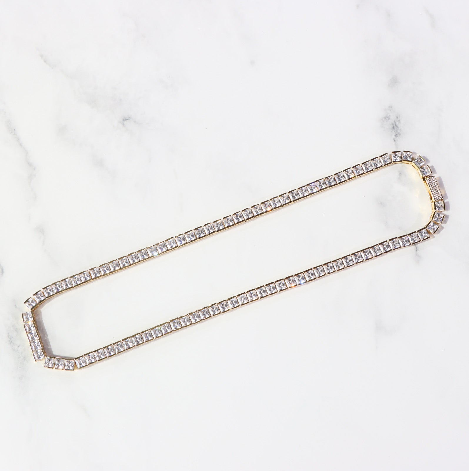 Introducing the Square Cut Diamond Tennis Chain, a stunning piece of jewelry that is sure to turn heads. This 4.5mm square cut diamond chain is made of 18K gold, and it sparkles and shines like no other. Whether you're dressing up for a special occasion or just looking to add a touch of luxury to your everyday style, this chain is the perfect choice. The diamonds are cut to perfection and catch the light beautifully, making this a truly eye-catching piece. Durable and built to last, this chain is also a great choice for those who want to wear it every day. Whether you're giving it as a gift or treating yourself, the Square Cut Diamond Tennis Chain is sure to impress.